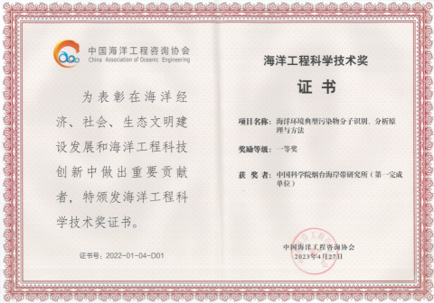 近日,中国海洋工程咨询协会颁发2022年度海洋工程科学技术奖获奖证书,我室陈令新研究员团队完成“海洋环境典型污染物分子识别、分析原理与方法”成果荣获该奖项一等奖。