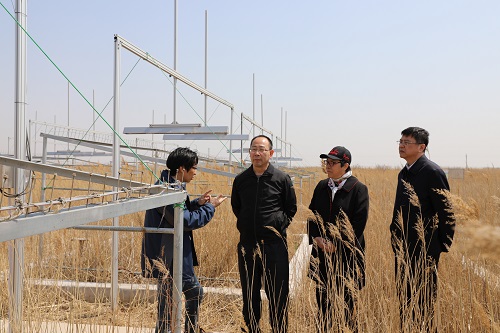 试验站站长韩广轩研究员向杨维才等介绍了黄河三角洲站的建站历程、功能定位、基础设施建设、立体观测体系、主要科研进展以及发展规划,并陪同前往试验样地现场调研了地表水与地下水控制、养分添加、增减雨、增温、降雨脉冲、季节性气候变化、刈割及凋落物清除、遮阴等多个野外控制试验平台。随后,杨维才和曹晓风等考察了中国科学院重点部署项目“边际土地产能效益扩增机理与藏粮于地技术模式”在黄河三角洲站的实施情况,参观了耐盐植物选育试验样地和“滨海盐碱地生态农牧场”的建设进展。杨维才和曹晓风高度赞扬了试验站科研人员脚踏实地、艰苦奋斗的科研精神,对试验站在滨海湿地研究中取得的成绩表示祝贺,并对黄河三角洲站对“藏粮于地”项目实施的大力支持表示感谢。