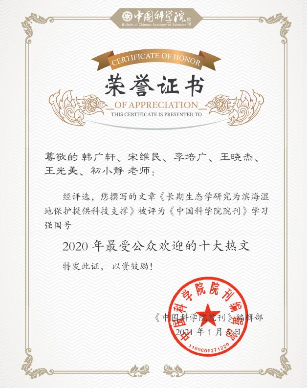 黄河三角洲站站长韩广轩研究员及其团队成员完成的《长期生态学研究为滨海湿地保护提供科技支撑》一文被《中国科学院院刊》学习强国号收入 “2020年最受观众欢迎的十大热文”。