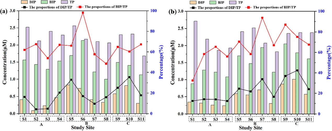 图1 烟台四十里湾表层水样(a)和底层水样(b)中DIP、BIP和TP浓度以及DIP和BIP分别占TP的百分比例
