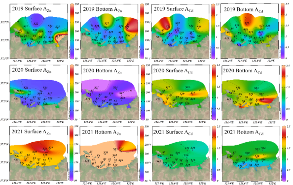 图2 烟台四十里湾活性态Zn和Cd浓度分布图