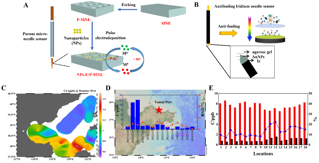 图3 微针传感器多孔化刻蚀(A)、凝胶保护层覆盖(B)方案及活性Cu在渤海分布特征(C)、烟台港连续变化规律(D)及近岸海水中活性Cu与总溶解Cu的配比关系(E)