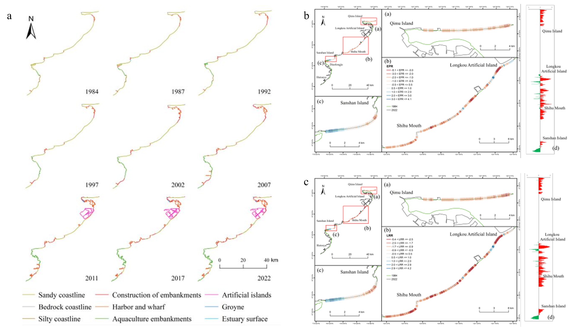 图1 研究区1984-2022岸线空间分布(a);EPR计算下区域砂质岸线侵蚀和淤积(b);LRR计算下区域砂质岸线侵蚀和淤积(c)