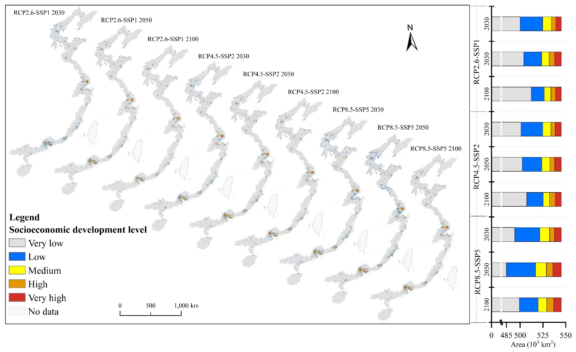 图2 三种情景下近、中、远期中国海岸带经济社会发展水平空间分布及其面积变化特征