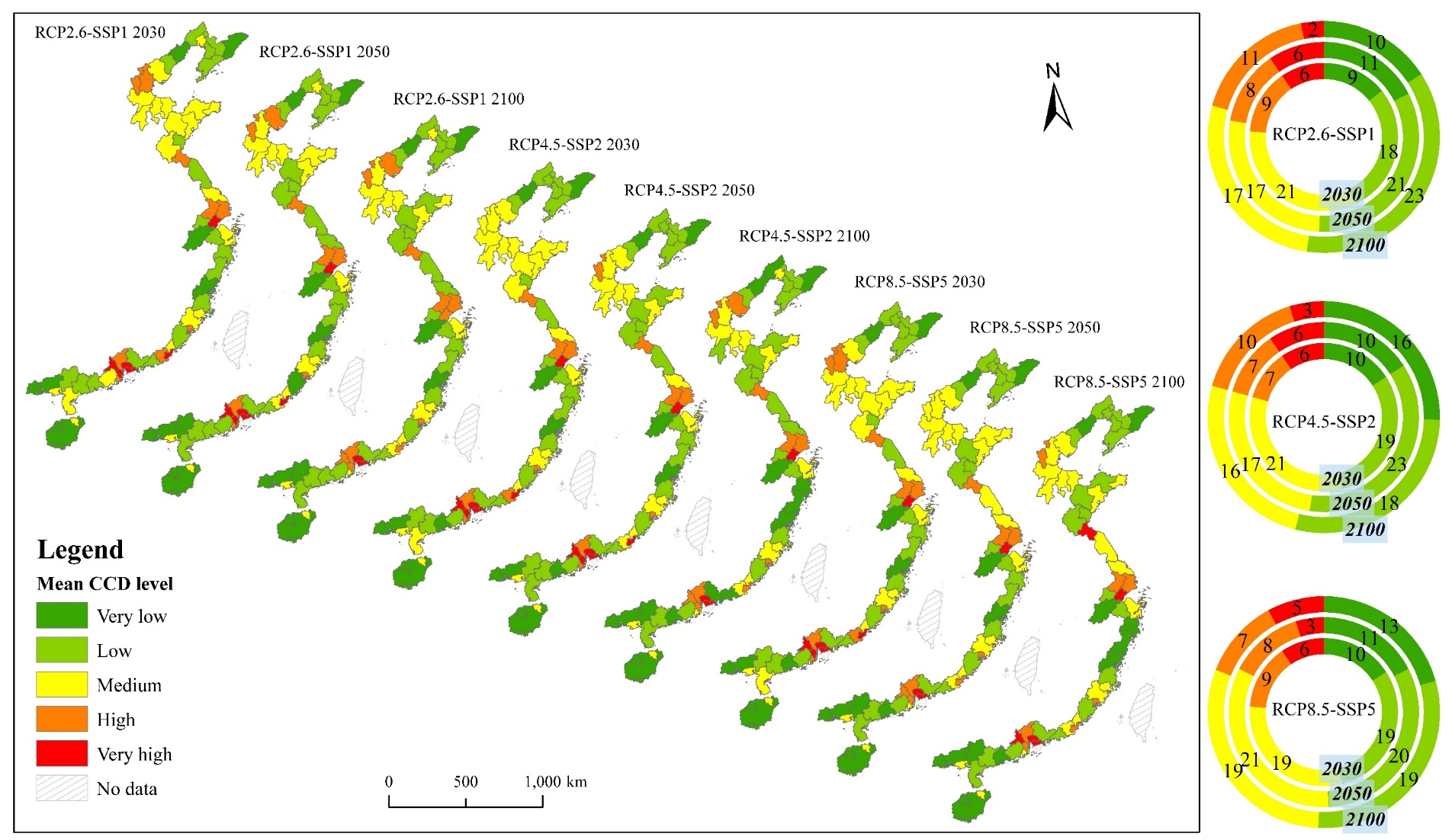 我室侯西勇研究员的团队联合英国卡迪夫大学水环境研究中心(Hydro-environmental Research Centre,Cardiff University,UK)Shunqi Pan教授团队基于遥感大数据、时空分析等技术方法开展了深入而细致的研究,包括:(1)利用深度损失函数,计算和分析未来时期(2030~2100年)不同情景下(RCP2.6-SSP1、RCP4.5-SSP2和RCP8.5-SSP5)中国海岸带海平面上升淹没预期影响的GDP和人口的数量和空间分布特征;(2)利用主客观综合赋权法,评估和分析未来时期不同情景下中国海岸带经济社会发展水平及其空间格局特征;(3)引入耦合协调度模型,揭示未来时期不同情景下中国海岸带海岸洪水风险和经济社会发展之间的同步性关系,并基于研究结果提出具体的适应性对策。