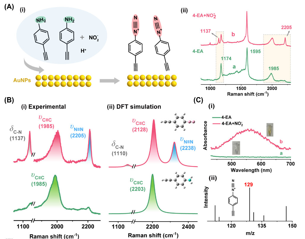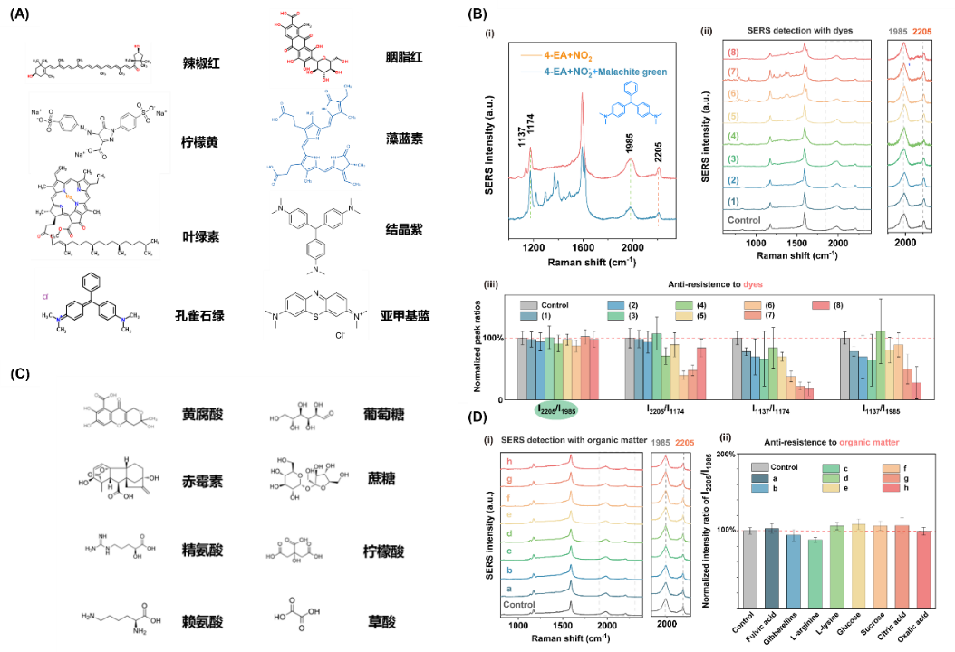海岸带环境监测中的光学检测技术具有灵敏度高、抗干扰能力强等优点,但这些技术也会面临海岸带特殊环境样品中的光学背景干扰影响(如色素等)。为了降低环境样品中背景光学干扰的问题,我室张志阳/陈令新团队提出了基于拉曼静默区分子指纹峰的表面增强拉曼散射光谱(SERS)传感新方法,用于色素等溶解性有机质(DOM)环境中的亚硝酸盐检测,并取得显著进展。