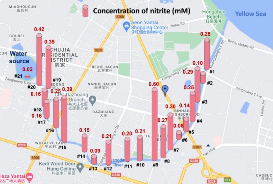 自然水体中腐殖质的光降解会产生大量亚硝酸盐,而且溶解性有机质(DOM)的存在会促进微生物对亚硝酸盐积累作用。研究团队以亚硝酸盐的检测为模型对象,提出了用于DOM环境下的亚硝酸根离子检测的SERS静默区传感方法(图1)。通过系统研究典型天然色素,人工色素,环境有机质,溶解性有机质标准品等潜在干扰物质影响(图2),证明了提出的SERS分析方法具有很强的抗干扰能力,并成功应用于含色素样品和高浓度天然有机质的环境样品。除此之外,还将该方法成功应用于当地河流(烟台市逛荡河)的亚硝酸盐调查(图3),证明该方法的实际应用潜力。
