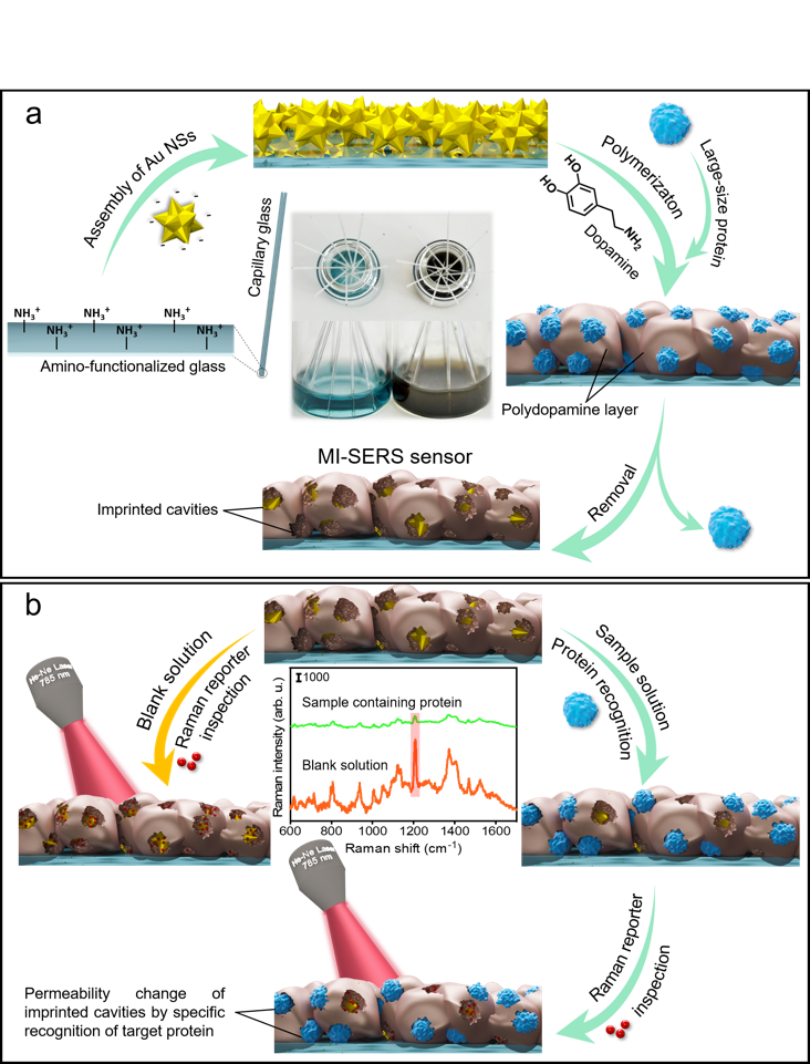 图1(a)MI-SERS传感器构建过程的示意图及实物图(MI-SERS传感器的AuNSs固定在氨基功能化玻璃毛细管表面和多巴胺表面印迹的正视图和俯视图);(b)MI-SERS传感器上实现RRIM的原理的示意图