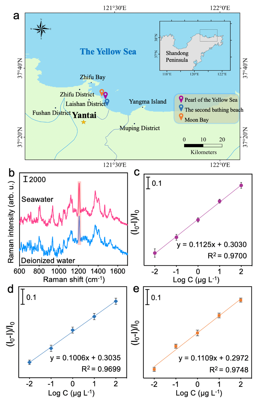 图2(a)在北黄海(烟台市)海域对海水的采样位置图;(b)MI-SERS传感器在去离子水(纯水)和海水样中的拉曼光谱图;(b)月亮湾、(c)黄海明珠、(d)第二海水浴场的海水中加标藻蓝蛋白的浓度对数与相对SERS强度之间的线性关系图