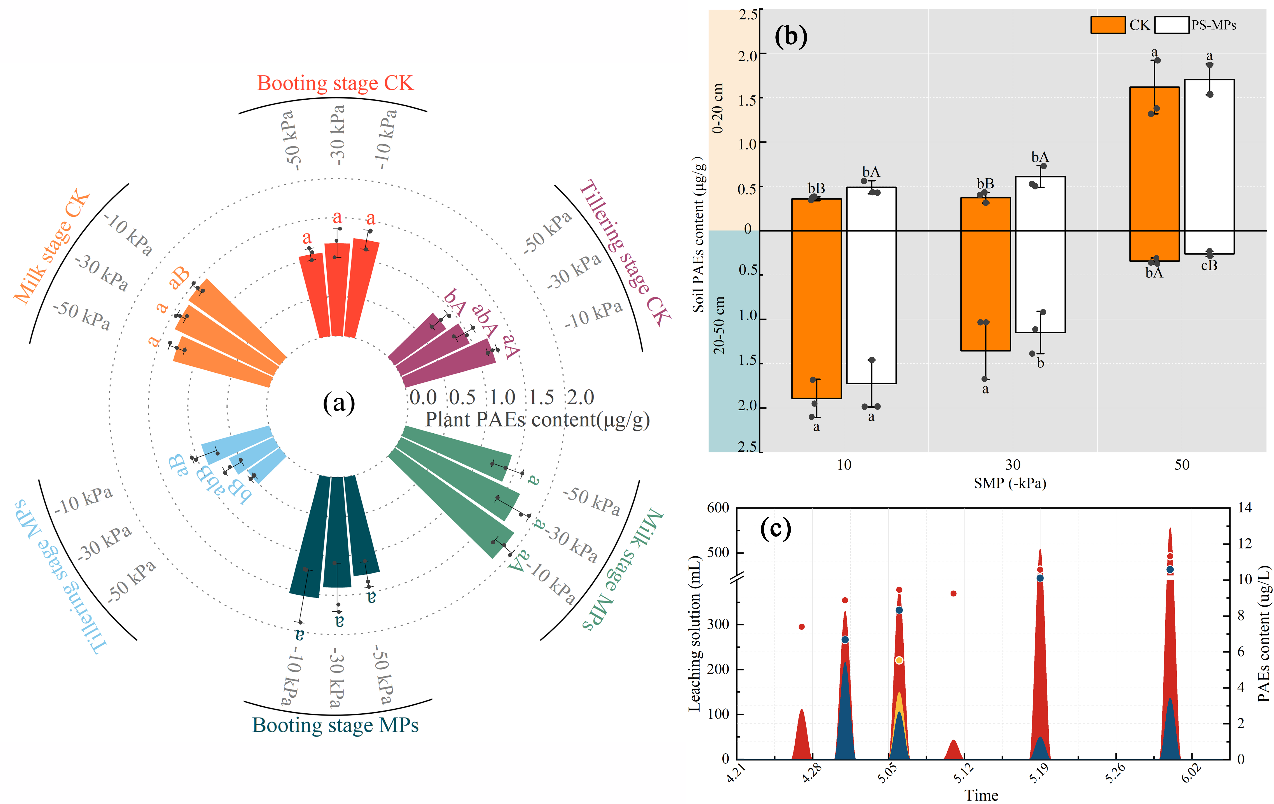研究团队基于黄河三角洲滨海盐碱地田间原位土柱试验,评估了在干旱季节使用受PAEs污染的再生水灌溉燕麦(Avena sativa L.)的可行性。研究设置了不同土壤污染条件下(有无MPs污染)3种基于土壤基质势阈值(-10kPa,-30 kPa,-50kPa)的再生水灌溉方案,探讨了再生水中PAEs与土壤中MPs的复合污染物在土壤-植物-地下水系统中的迁移分布以及对燕麦生理生长的影响。结果表明,低水势阈值(-50kPa)调控灌溉诱导了燕麦的干旱压力和氧化损伤,这一结果在乳熟期尤为显著。不同灌溉处理影响了PAEs在植物、土壤和渗滤液中的积累。在中土壤基质势(-30 kPa)条件下,与低土壤基质势(-50kPa)的干旱条件相比,燕麦的地上生物量增加了3.1%-14.0%,根生物量显著增加。高土壤基质势阈值(-10kPa)处理中,有无MPs添加的渗滤液与灌溉水的比例分别为1.18%和4.48%,加剧了深层土壤中污染物的积累,可能导致地下水污染。中土壤基质势(-30 kPa)能够缓解燕麦干旱胁迫和氧化损伤,并降低污染物向地下水的迁移风险,实现在抗旱与安全利用间的平衡。土壤中的MPs污染增加了收获燕麦中PAEs的含量,减少了PAEs在深层土壤(20-50 cm)和渗滤液中的运输和积累。灌溉水中的PAEs与土壤MPs污染的耦合可能加剧植物损伤,但在中土壤基质势阈值(-30 kPa)下的调控灌溉可以平衡作物产量和潜在风险。
