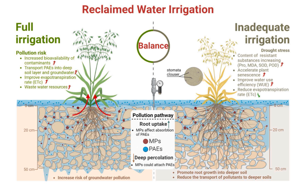在全球范围内,农业地区面临着日益严重的水资源短缺问题,再生水灌溉作为一种关键的替代方案被广泛应用。然而,再生水灌溉过程中的土壤中的微塑料(MPs)污染大大增加了再生水中污染物(如邻苯二甲酸酯PAEs)的暴露风险和毒性效应。这不仅影响作物的生长,还可能对环境造成长期污染。因此,如何安全有效地利用再生水进行灌溉,同时控制和减少污染物的风险,是当前研究的重要课题。