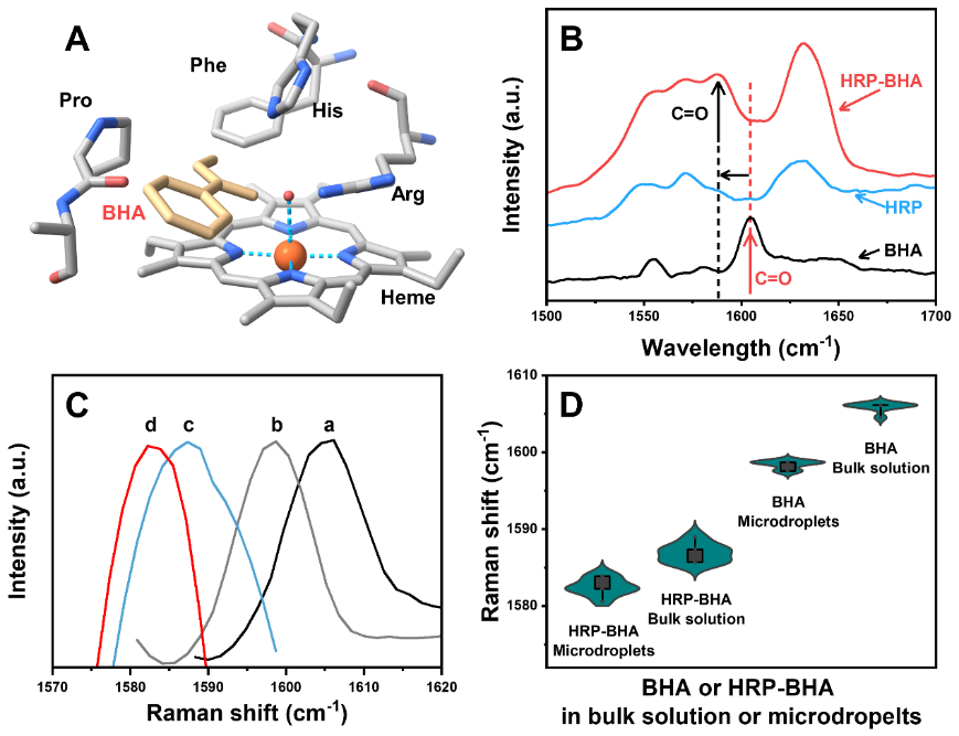 利用辣根过氧化物酶(HRP)的典型分子抑制剂-苯并羟肟酸(BHA),并基于振动斯塔克效应,探测了本体溶液和微滴(气溶胶)界面处HRP的内部电场。研究进一步测量了微滴(气溶胶)中HRP的催化动力学和催化选择性,首次发现了微滴(气溶胶)可以增强酶催化反应的选择性(反应路径选择性和底物选择性)。通过密度泛函理论和分子动力学模拟,证实了微滴(气溶胶)界面超强电场(107V cm-1)是增强HRP内部电场,并影响催化活性和催化选择性的关键机制。本研究不仅明确了微滴(气溶胶)增强酶活性的机制,还进一步探索了微滴反应器在高灵敏生物分析和高效生物合成的应用。