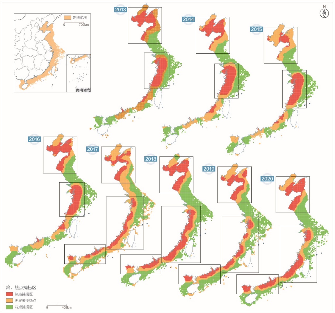 图1 中国大陆沿海冷热点渔业捕捞区(Geng et al., 2023)