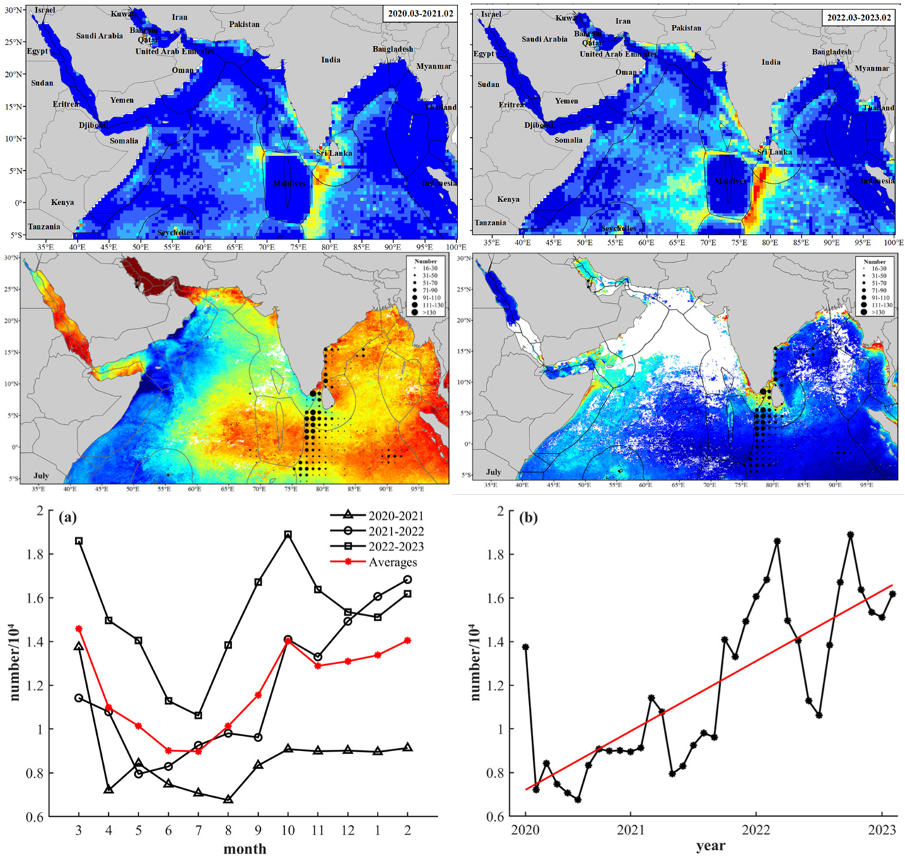 基于船舶AIS及卫星遥感数据在北印度洋的观测研究表明(Li et al., 2024),北印度洋渔船高度集中在马尔代夫、阿曼等专属经济区外围印度洋公海、保克海峡、印度近岸海域,塞舌尔群岛海域及巴林湾的捕捞区和开放式养殖用海海域。北印度洋渔业活动有明显的季节性,每年7月渔业活动强度最低,与台风活动以及高温有关。受COVID-19疫情影响,2020年海上渔船数据急剧下降;随后至2023年,渔船活动热度逐年上升。