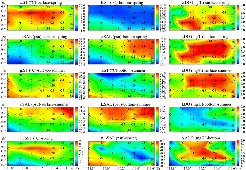 溶解氧(DO)对大多数海洋生物的生存至关重要,不同的水生生物需要特定的DO浓度来维持其生命活动。当DO值降至3-4 mg/L时,许多海洋生物受到显著影响;当DO值< 3 mg/L时,部分鱼类可能死亡,严重影响底栖生物的生长和生存;当DO值< 2 mg/L时,大多数生物要么死亡,要么迁移至更适宜居住的环境。已有研究表明,夏季渤海中部也有季节性低氧事件发生,但是目前对于河口海湾低氧事件的物理生物地球化学驱动机制的系统认识不足。近日,中国科学院烟台海岸带研究所过杰研究员课题组基于渤海中部2022年春、夏两季的调查数据(5月28日至6月2日和8月29日至9月4日),探讨了2022年渤海中部夏季低氧的原因及机制。