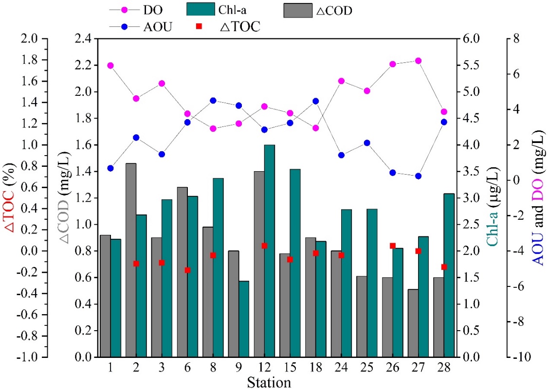 (夏季DO、Chl-a、AOU值来自水体底部;ΔCOD为春夏季水体底层COD的差值;ΔTOC为春季和夏季沉积物中TOC的差异。条形图中没有红框表示缺少测试数据)