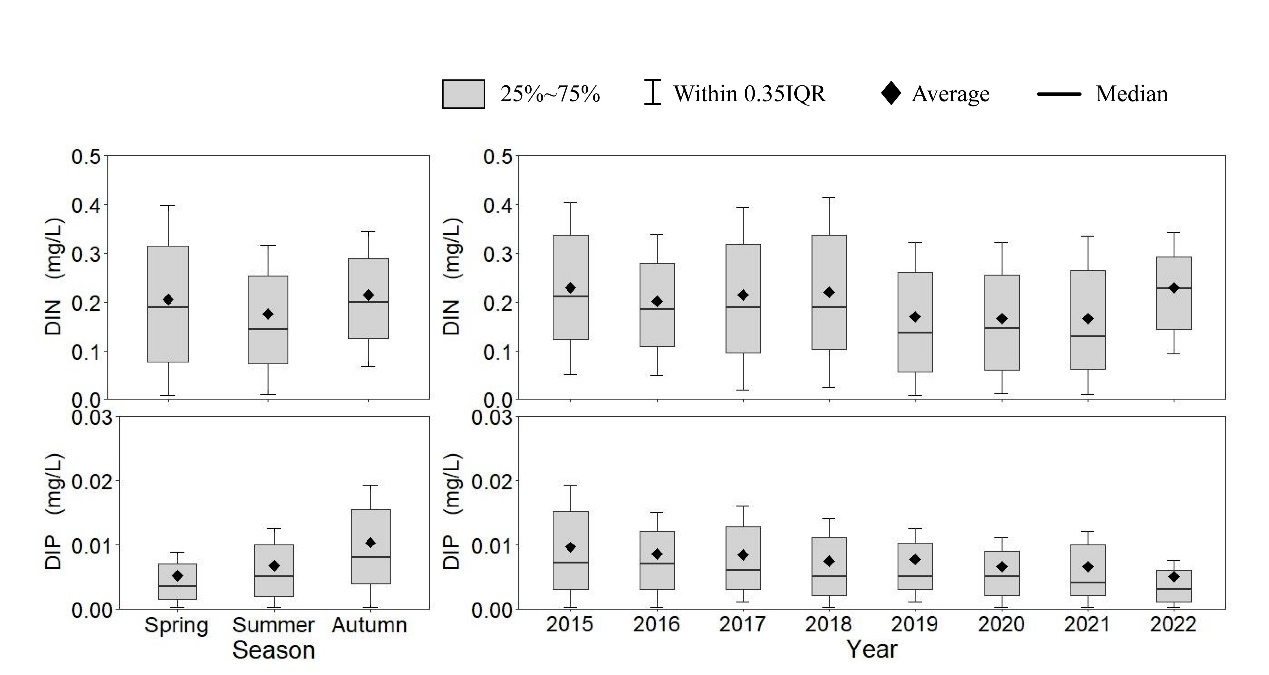 研究发现,季节上,DIN浓度秋季最高,夏季最低;DIP浓度秋季最高,春季最低。年际变化上,DIN在2015 - 2022年呈先降低后升高的波动趋势,而同期DIP浓度则呈现下降趋势。空间上,DIN浓度高值集中在海湾处;而DIP浓度则呈现出“北高南低”的分布,且这种现象在秋季极为显著。