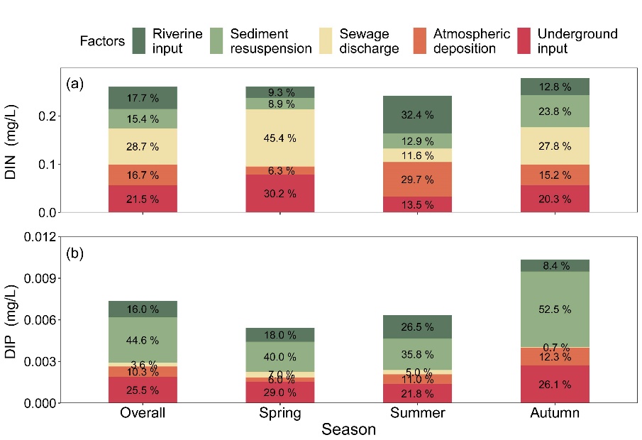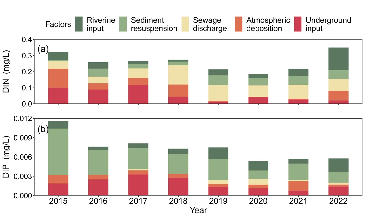 PMF模型(The positive matrix factorization model)分析认为,渤海DIN和DIP的来源主要是河流输入、沉积物再悬浮、市政污水排放、大气沉降和地下水输入。2015-2022年间,DIN的最主要来源为市政污水排放,其贡献比例达28.7%,这一点在以往研究中未受到充分重视。同时也发现,市政污水排放是渤海春季和秋季最主要的DIN污染源。对于DIP而言,其最大贡献者是沉积物再悬浮,其贡献比例高达44.6%,秋季表现最为显著。此外,2021年和2022年观测到的DIN浓度增加主要归因于夏季和秋季降水量的增加,特别是强降雨事件导致了河流输入和大气沉降的增量输入。