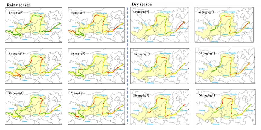 另外,黄河悬浮泥沙对重金属污染物具有较强的储存能力,揭示了泥沙携带Cd具有最高的生态风险和流动性,Cd重污染区主要集中在工业化和人类活动水平较高的地区,如内蒙古、河南和山东(图5),生态风险较高。