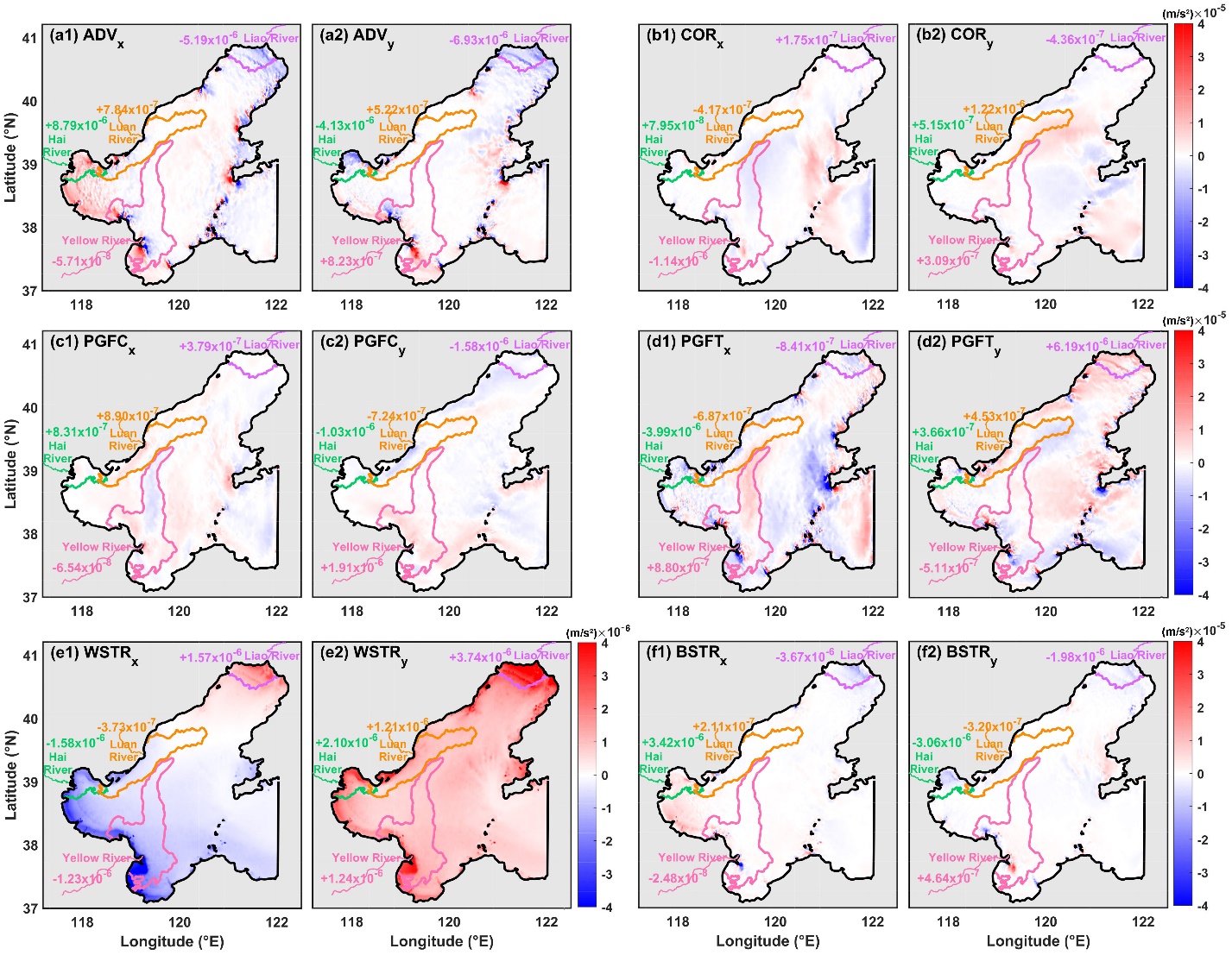 动量平衡分析表明,风引起的埃克曼输运加强了黄河和滦河入海口区域近海与外海之间的联系,将河流物质从海岸区域向远处扩散;而渤海湾和辽东湾区域的水平平流和粘性力主导作用超过了埃克曼输运,导致其近海与外海联系减弱,溴系阻燃剂则被局限于当地海区(图2)。