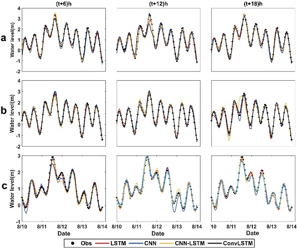 图3 ML模型提前6、12和18小时预测“利奇马 1909”风暴潮