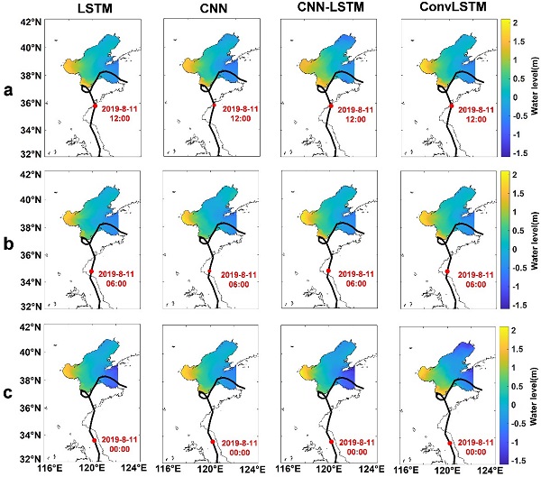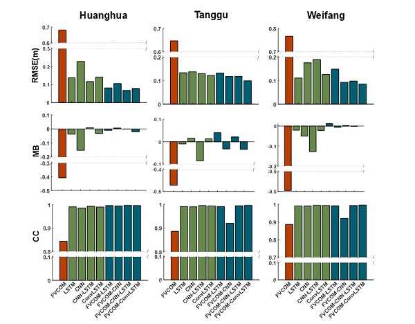 进一步研究发现,4种ML模型对单站点、单步风暴潮的预报精度差异并不显著,预报精度随预报提前时间的增加而降低,而且ML模型对渤海湾和莱州湾风暴潮的预报精度高于辽东湾。综合模型对单站点、多步的预测精度比单个模型高1/3以上,对多站点、多步风暴潮的预报能力明显优于单个模型。结合机器学习与数值模型,FVCOM-CNN-LSTM和FVCOM-ConvLSTM具有较高的预测能力。与ML只遵循目标函数而不遵循物理原理不同,FVCOM-ML有效降低了传统方法固有的不确定性,提高了对渤海风暴潮的预测准确度。与单一模型相比,结合ML的综合模型可将渤海风暴潮预报精度提高18%,而且可以降低风暴潮预测成本,使得ML模型有望成为未来风暴潮的快速反应预测系统。