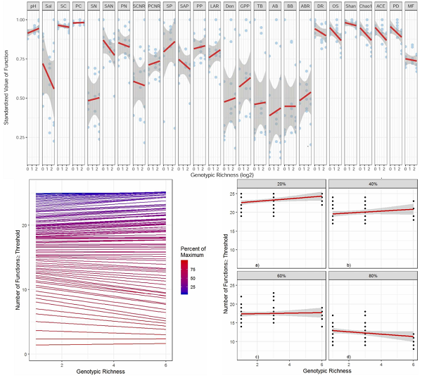 基于中国科学院黄河三角洲滨海湿地生态试验站,研究人员开展了同质园实验,探讨了芦苇(Phragmites australis)基因型丰富度其与生态系统多功能性之间的关系(图1)。研究结果表明,黄河三角洲滨海湿地芦苇基因型丰富度对生态系统功能(EFs)的影响存在差异,尤其在土壤细菌丰富度方面,芦苇遗传丰富度表现出显著的负向效应。进一步分析发现,随着基因型丰富度的增加,生态系统平均多功能性指数呈现下降趋势,这可能归因于不同基因型间的竞争,导致了生态系统多功能性的降低。此外,在不同生态系统功能阈值(即功能指标达到其最大值的比例,分别为20%、40%和60%)时,较高的基因型丰富度促进了更多生态系统功能指标达到最大值,而更高的阈值水平(80%)下,较高的基因型丰富度反而减少了达到最大值的生态系统功能指标数量。因此,植物基因型丰富度的增加可能会削弱生态系统的多功能性,引入新的基因型时应谨慎评估其潜在影响,以避免降低生态系统多功能性(Zhang et al.,2025,Global Ecology and Conservation)。