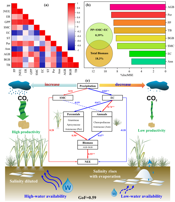依托降雨量梯度变化控制实验平台,对生态系统净CO2交换(NEE)和植物群落生命形式(多年生/一年生)组成开展了为期三年(2020-2022)的监测分析(图2)。结果表明,所有处理下湿地均表现为CO2吸收汇(NEE<0)。降雨量变化引起的土壤盐分变化是引起植物群落生命形式组成改变的关键。降雨量增加带来的土壤脱盐有利于芦苇和白茅等多年生植物生长,这类植物普遍具有较高生物量,进而通过提高初级生产力促进NEE。相反,降雨量减少会造成土壤盐胁迫,个体矮小、繁殖速度更快的一年生植物(盐地碱蓬、碱菀)表现出更强耐盐性,取代多年生植物成为优势物种,但这类植物生物量低下,会抑制初级生产力进而减少NEE。总之,降雨量变化导致的植物生命形式组成差异会对NEE产生重大影响,相关结果对于简化生态系统研究、提升未来湿地生态管理水平具有重要参考价值(Liang et al.,2025,Agricultural and Forest Meteorology)。