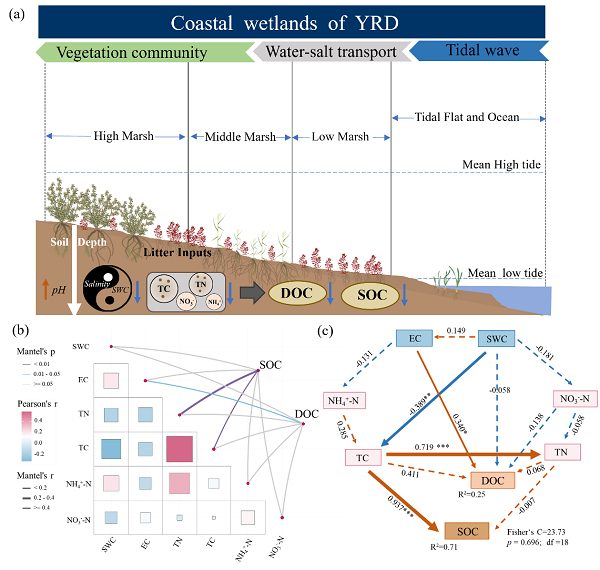 潮汐湿地作为全球碳循环的重要“蓝碳”资源库,其固碳能力备受关注。潮间带由海到陆水盐梯度差异塑造了不同的植被类型,探究不同植被类型下有机碳动态对于理解和预测全球碳循环、制定海岸带生态系统管理和保护策略具有重要意义。基于黄河三角洲潮汐湿地四种典型植被区域的研究发现,不同植被类型沿陆海梯度其SOC水平存在显著差异,其中,低潮潮滩碱蓬表现出最高的SOC水平,中高潮潮滩芦苇最低。此外,研究还发现在1米范围内,不同植被类型的SOC存在垂直变化,基于Mantel分析和结构方程模型(SEM),进一步揭示了土壤水分含量(SWC)通过影响植被类型来调节SOC含量的机制(图4)(Jia et al.,2024,Marine Pollution Bulletin)。