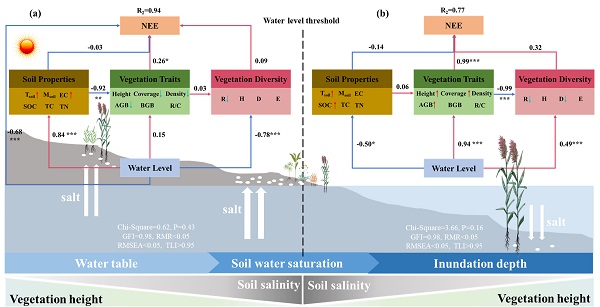 此外,研究通过结构方程模型与随机森林进一步分析,明确了水位调控碳汇功能的双路径机制:水位低于地表阶段,土壤盐分和含水量等因素主导植被生长和碳汇过程;水位高于地表阶段,植株高度和覆盖度等植被性状成为驱动碳汇的核心变量(图2)。研究同时指出,水位变化引发植被群落优势种发生转换,由耐旱性强的一年生低冠层植物(如Suaeda glauca)向多年生高冠层植物(如Phragmites australis)演替,从而驱动生态系统总初级生产力(GPP)、生态系统呼吸(Reco)及生态系统净CO₂交换(NEE)的整体跃迁。