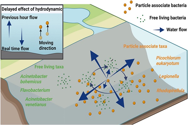 水动力条件是河口区域调控PFAS迁移扩散、影响微生物群落的空间分布关键因素之一(图2)。河口区域细菌群落的研究分析表明,颗粒附着菌群在PFAS污染监测中更为稳定,可作为优异的新型生物标志物,据此提出了水流迁移路径监测的创新性技术方案。该方案基于河流与海洋微生物菌群差异,解析区域特有细菌类群、追踪水流方向(图3),旨在无专业水文监测设备情境下,助力PFAS等水流迁移污染物的传输过程解析。