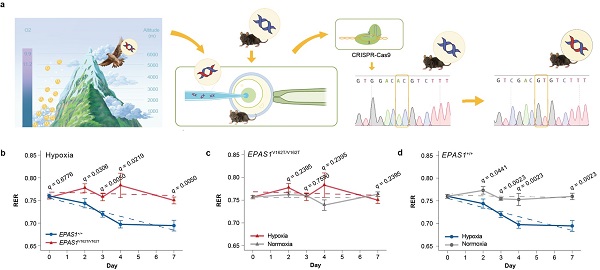 研究运用基因编辑技术首次建立了EPAS1隼型小鼠模型,在模拟慢性低氧环境下,利用呼吸交换率(RER)来探究隼型小鼠在低氧条件下的糖、脂代谢偏向性。低氧处理后,隼型小鼠的RER值在0.75附近随机波动,而野生型小鼠的RER值显著降低(脂代谢偏向),说明隼型小鼠在低氧下具有维持糖脂代谢平衡的能力。肝脏转录组、代谢组分析印证了隼型小鼠肝具有更好的糖脂代谢调节能力。功能验证实验发现突变型EPAS1蛋白活性降低,钝化了隼型小鼠的低氧反应。此外,研究还分析了行为调节在隼型小鼠糖脂代谢稳态维持中的重要作用。从进化角度看,隼型小鼠维持糖脂代谢稳态在机体应对低氧胁迫时具有重要意义:体重在低氧下可较快恢复,减少体内氧化应激反应,并提高急性低氧下小鼠的存活率。