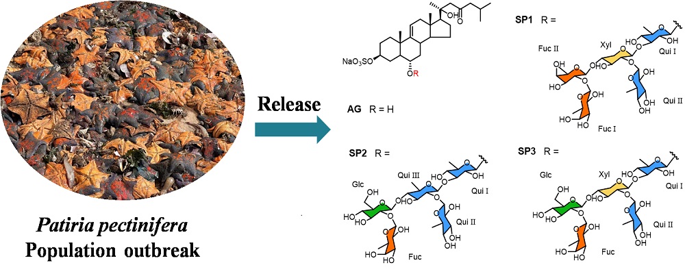针对近年来黄渤海近岸海域海燕(Patiria pectinifera)异常暴发及其对养殖业造成的生态与经济风险,研究团队从该物种中分离纯化出三种海星皂苷(SP1–SP3)及其共同苷元(AG),并以经典海洋生态毒理模型生物——海水青鳉(Oryzias melastigma)胚胎为对象,系统评估其毒性效应与分子作用机制。
