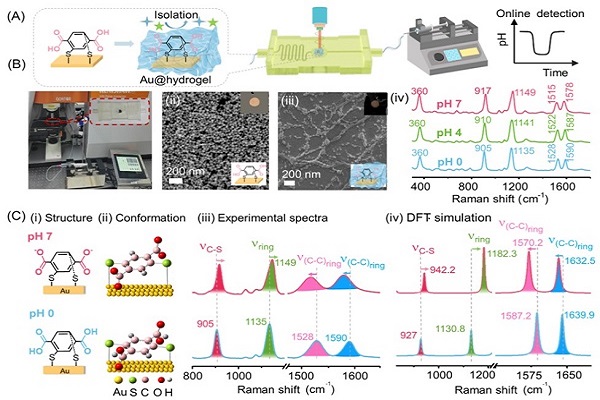 图1基于水凝胶隔离与双羧酸响应SERS探针的在线pH传感器原理示意图