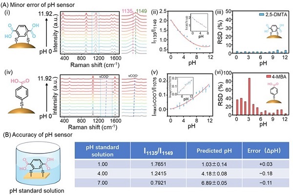 创新点一:设计了具有双羧基pH响应基团的新型SERS探针2,5-DMTA。该探针在质子化/去质子化过程中所产生的光谱变化远优于传统单羧基探针4-MBA,能够在pH 0–7的酸性范围内表现出优异的线性响应(R² = 0.9786),显著改善了4-MBA在强酸条件下响应弱、误差高(RSD ≈ 20%)的问题,将检测精度提升至RSD < 5%,极大增强了酸性环境下的定量可靠性。