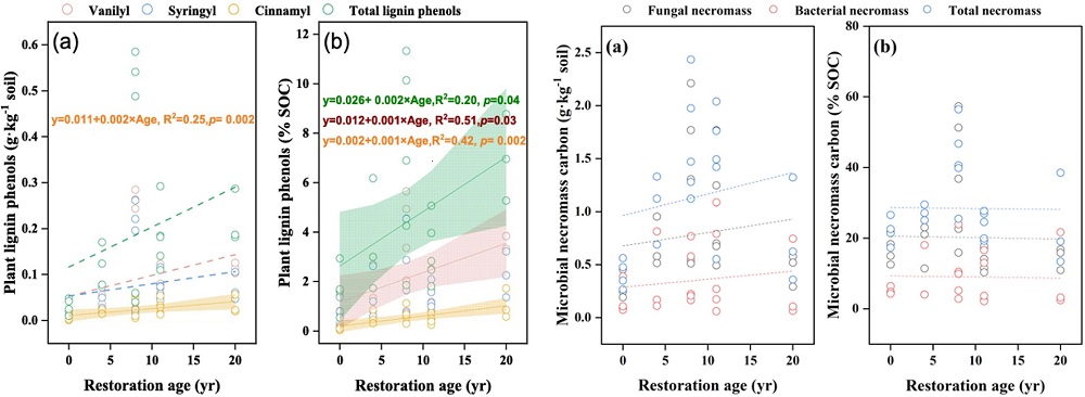 依托中国科学院黄河三角洲滨海湿地生态试验站,本研究选取了该区域不同恢复年限(0年、4年、8年、11年、20年)的滨海湿地进行对比,通过时空替代法系统分析了植被恢复年限对土壤有机碳来源的影响。结果显示,随着恢复年限延长,土壤有机碳中源于植物的组分(如木质素酚类)所占比例逐步上升,并与恢复年限呈显著正相关。相比之下,微生物残体碳(MNC)的贡献变化幅度较小,未表现出明显的增加趋势。因此,湿地恢复过程中植物来源碳对恢复年限的响应更为显著,是驱动土壤有机碳累积的主要因素(图1)。
