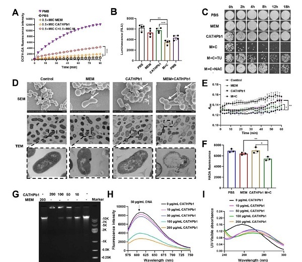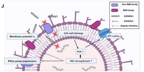 不同于传统抗菌肽主要通过破坏细菌细胞膜以增强抗生素渗透的增效作用机制,本研究揭示,CATHPb1在亚抑菌浓度下几乎不破坏耐药细菌的细胞膜,而是通过一套全新的、非膜破坏性的多层面机制实现其广谱增效作用,具体包括:(1)选择性抑制外排泵(核心机制):CATHPb1能选择性抑制主要易化子超家族(MFS)、小多药耐药家族(SMR)、蛋白细菌抗菌化合物外排家族(PACE)的外排泵(而非传统的RND型泵),阻止细菌将抗生素“泵出”胞外,导致抗生素在菌体内累积。(2)诱导活性氧(ROS)生成:与抗生素联用可显著增加细菌内的ROS水平,造成氧化损伤。(3)破坏细胞壁:低浓度下即可削弱细菌细胞壁,与美罗培南等靶向细胞壁的抗生素产生协同破坏。(4)结合细菌DNA:CATHPb1能够进入菌体并与细菌基因组DNA结合,干扰其正常功能。