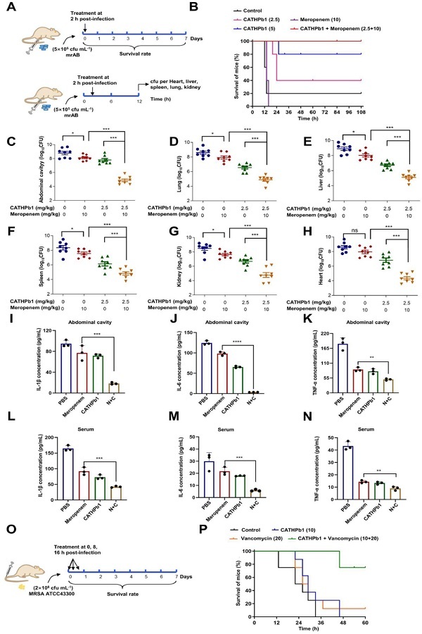 研究人员进一步用耐药菌构建了小鼠腹膜炎模型和菌血症模型,检测了CATHPb1与抗生素联用的体内治疗效果。结果表明,CATHPb1与抗生素联用能够逆转细菌耐药性,显著提高小鼠存活率,降低小鼠不同内脏组织中的细菌载量,有效缓解感染所致的炎症反应。