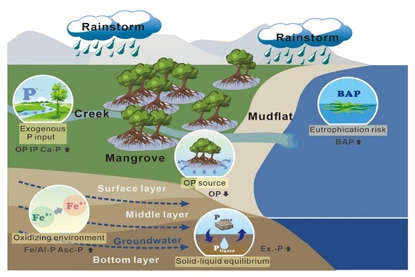 图2 红树林-潮沟系统磷组分对暴雨的响应示意图