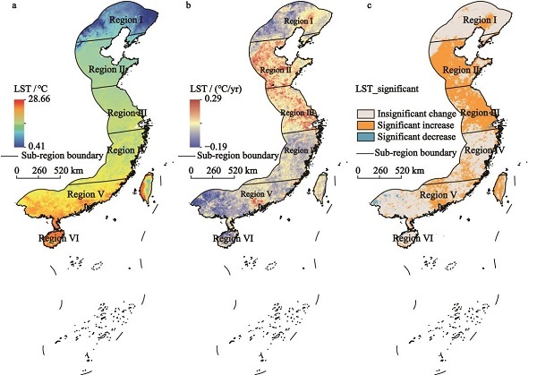 图1 2001—2021年中国东部地区地表温度(LST)的空间分布特征:多年平均值(a),年际变化率(b)以及显著性(c)