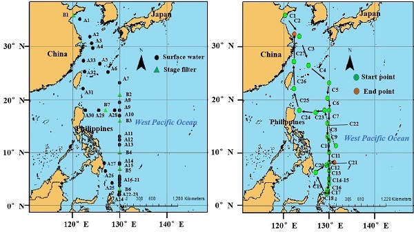 图 1航次采样站位分布:表层水及分级过滤采样站位(图左);大气采样站位(图右)