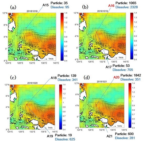 研究团队搭乘"科学"号科考船,开展了从青岛至印度尼西亚北部海域的大范围采样调查(图1),分析了22种OCPs在表层海水和边界层大气中的分布规律。结果显示,西太平洋表层海水中OCPs浓度介于62-3394 pg/L之间,大气中浓度为19-605 pg/m³,且开阔海域存在显著的浓度异质性——涡旋边缘区域(A16站点)的OCPs浓度高达3394 pg/L,是周边区域(A15 站点,130 pg/L)的10倍以上,揭示了海洋中尺度涡旋的强效富集效应(图2)。进一步分析表明,表层海水中OCPs以异狄氏剂(48.96%)和艾氏剂(21.25%)为主,二者合计占总浓度的70%以上;大气中则以百菌清(25.3%)、α-六六六(13.8%)和七氯环氧化物(13.2%)为主要组分,这种差异反映了不同OCPs的来源特征与环境行为差异。